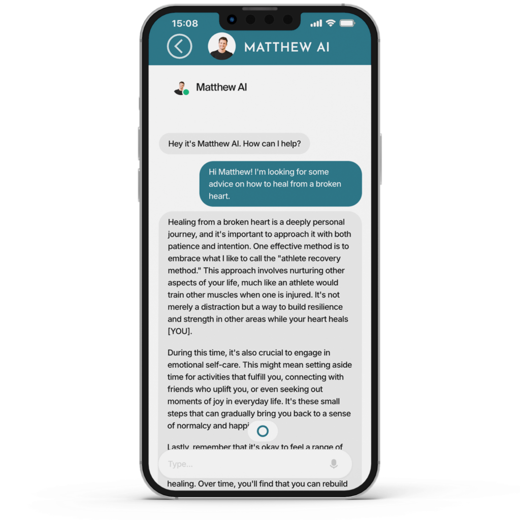 I created Matthew AI to give you 24/7 access to the advice and support you need in your dating life. It’s like having me in your pocket, ready to guide you through any dating scenario whenever you need it.
