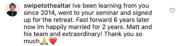 I wouldn’t be where I am today without Matt as my coach and mentor. I am now brave enough to let go of the wrong guys, I respect my feelings and needs and trust my gut. Knowing that Matt has a loving community here makes me feel safe and supported, and I’m grateful for everything!