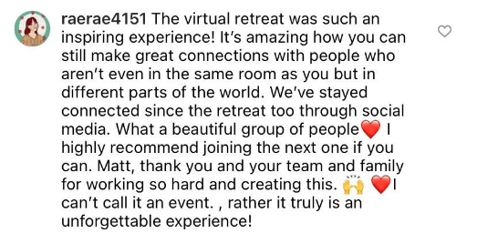 Since the Retreat, I have been living my best life. I am so happy with who I am. I took everything I learned from that Retreat and what Matthew said and I took those tools and put it into my everyday life now. I’m the best version of myself and the happiest I’ve ever felt.